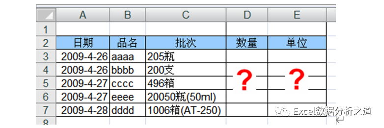 图1-72的A列至C列数据为从数据库导出的数据,其中把C列的批次是数量和单位的混合字符串。现在要求把批次分成数量和单位两部分,分别保存在D列和E列,以便于以后进行统计分析。