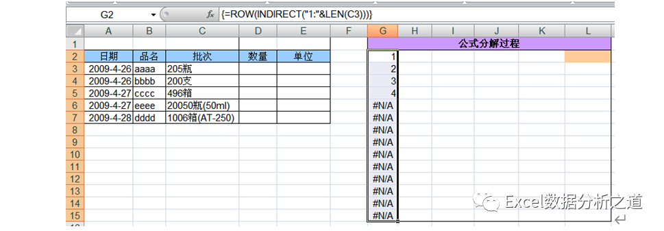 要想判断批次数据中从左边开始哪些字符是数字,到哪个字符就由数字变为了文本,需要知道批次数据有多少个字符,然后利用MID函数把每个字符取出来。因此,使用LEN函数得到批次数据的长度,再利用INDIRECT函数和ROW函数得到一个从1开始到批次数据长度结束的自然数序列:选择单元格区域G2:G15(或者G列从第2行开始到某行为止,这个行数要大于批次数据字符长度),输入数组公式: