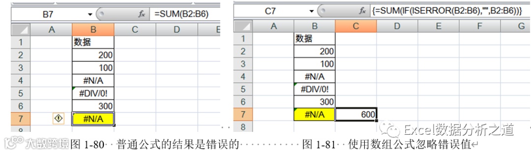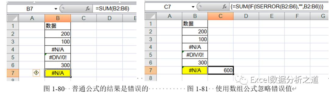 有时候报表中会有一些错误值,这时如果使用SUM函数进行加总的话,就会出现错误,而得不到正确的结果,如图1-80所示。为了能够得到正确的计算结果,也就是忽略错误值,仅仅计算单元格区域的数值,就需要使用下面的数组公式了(参见图1-81):