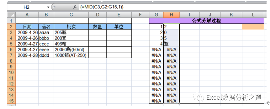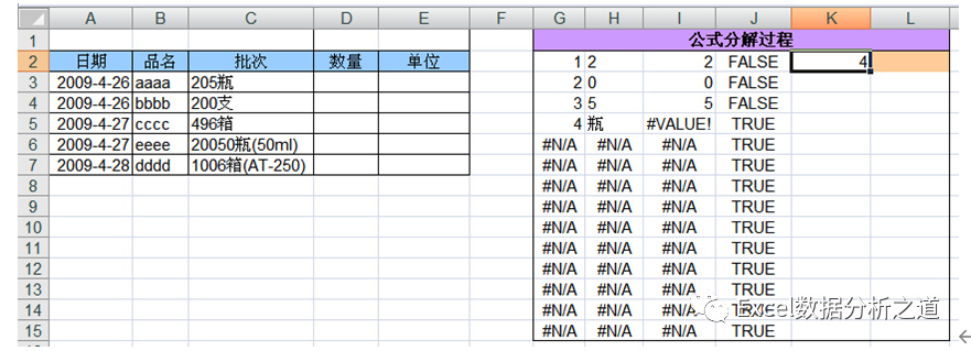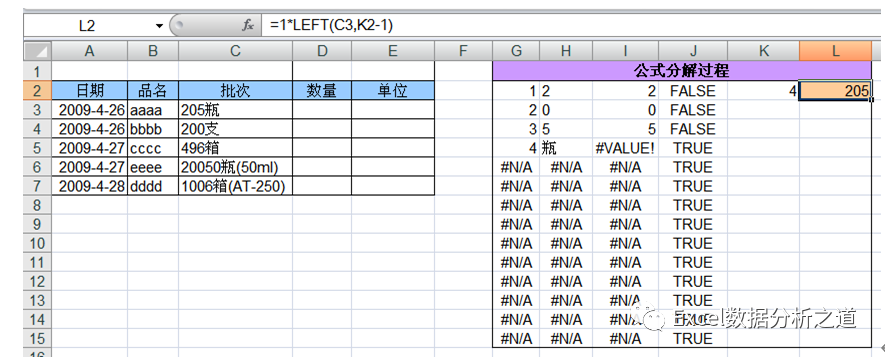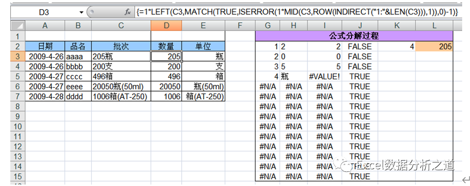 要将批次中的数量和单位分开,需要了解批次数据中从左边开始哪些字符是数字,到哪个字符就由数字变为了文本(汉字或字母),这样才能利用文本函数LEFT把数量取出来,利用文本函数MID把批次取出来。下面我们以第3行单元格C3的批次数据为例,说明解决问题思路和公式的创建方法及步骤。