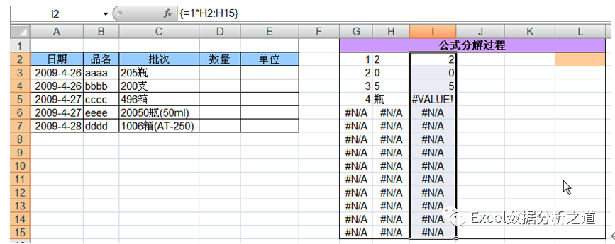 由于利用MID函数从字符串中取出的不论是数字还是文本,都是被处理成文本的,因此需要把取出来的批次数据中代表数量的数字转换成真正的数字,选择单元格区域I2:I15,输入数组公式“=1*H2:H