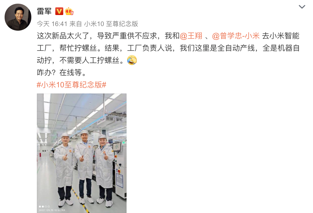 雷军也发文表示「这次新品太火了,导致严重供不应求,我和王翔、曾学忠去工厂拧螺丝」,但没想到因为是小米智能工厂,全自动产线,全是机器自动拧,不需要人工拧螺丝,最后就拍了张合影。