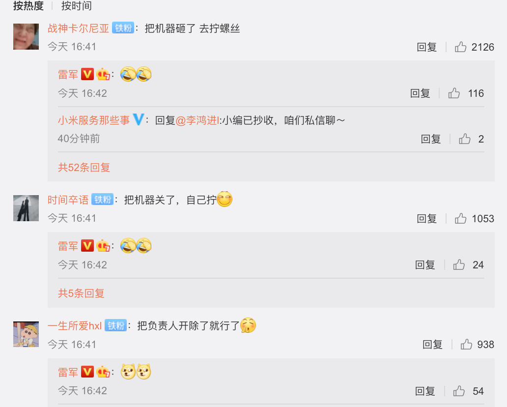 见此,微博网友也是各种调侃,建议雷总等人把机器关了,再去亲自上场拧螺丝。