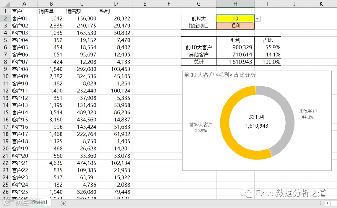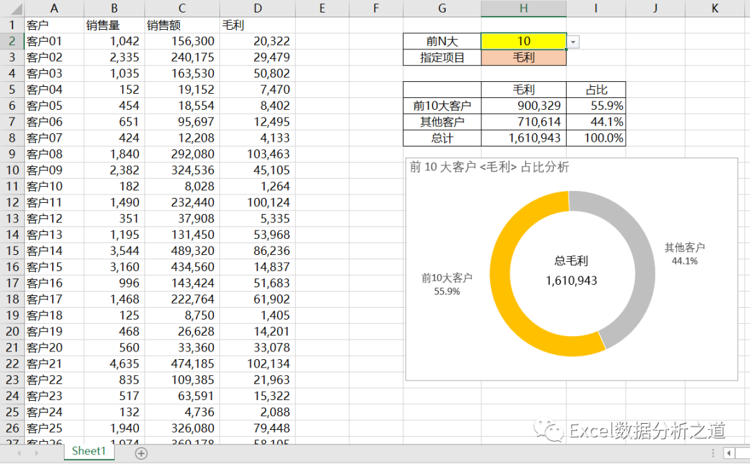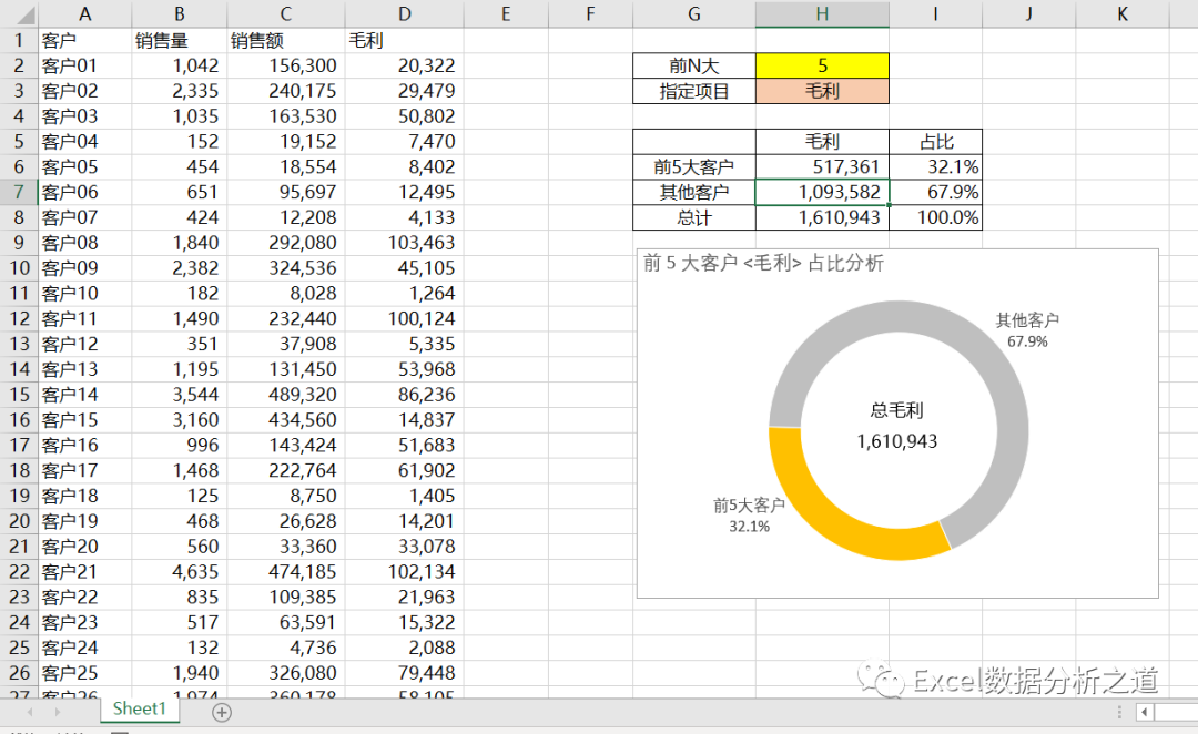 如何分析指定项目(销量、销售额或毛利)的前N大客户占比?