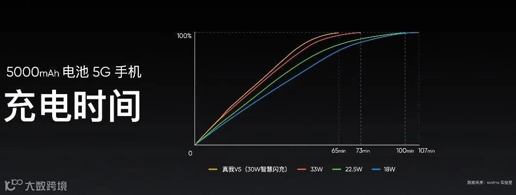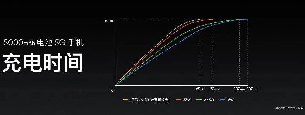 主打卖点上,realme V5内置5000mAh大电池,30W快充,支持OTG反向充电,65分钟充至100%,官方发布会上还吊打了一波vivo的33W快充。就实测来说,续航和功耗真的刚到顶了。