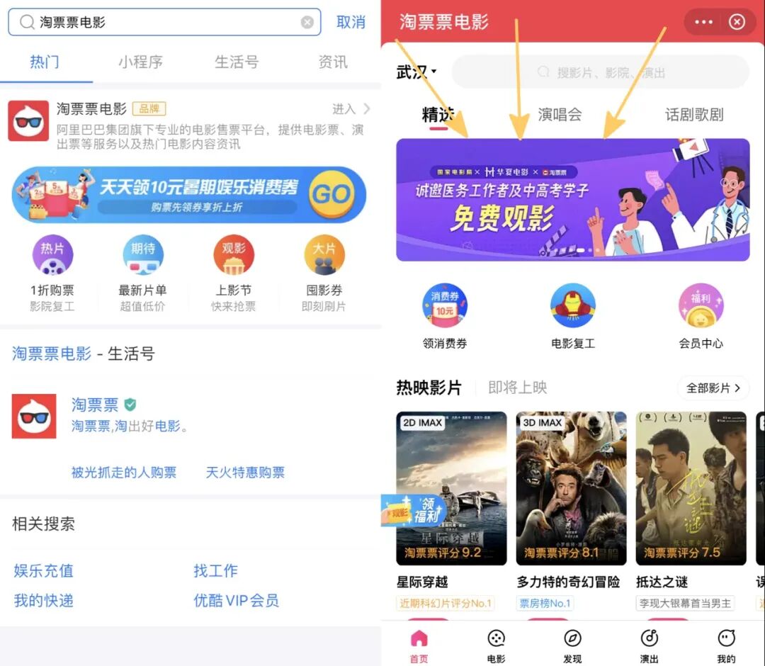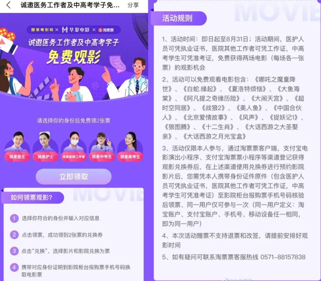 淘票票面向「医生、护士、医院工作者、中考生、高考生」推出了赠票活动