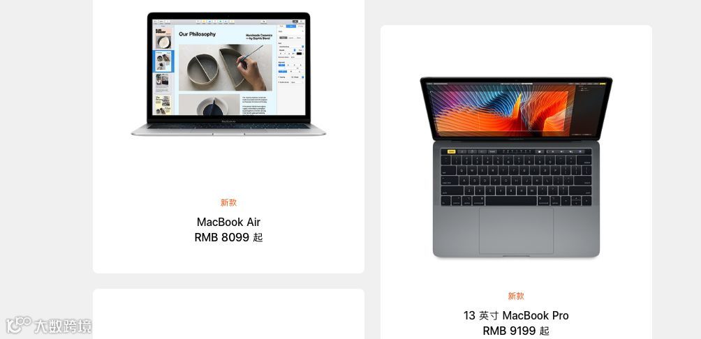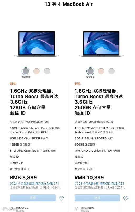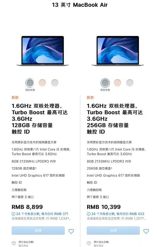 新款 13 英寸 MacBook Air,搭载英特尔第八代双核酷睿 i5 处理器 1.6 GHz ,依旧是LPDDR 3内存,2 个雷雳三接口,8+128GB 版售价 8899元,8+256GB 版售价 10399 元。