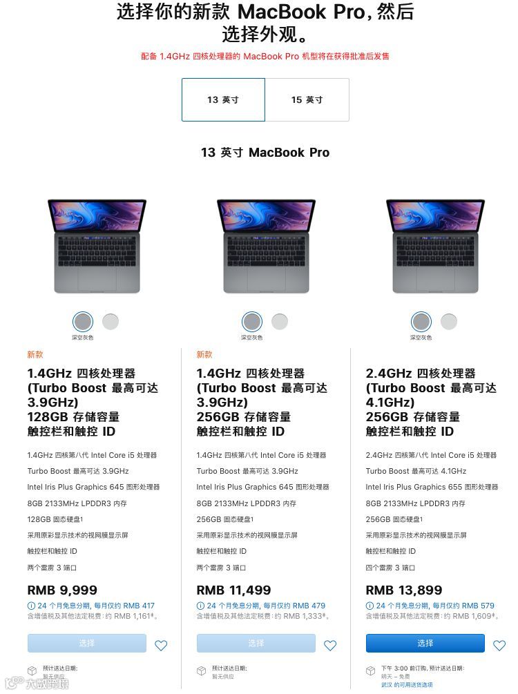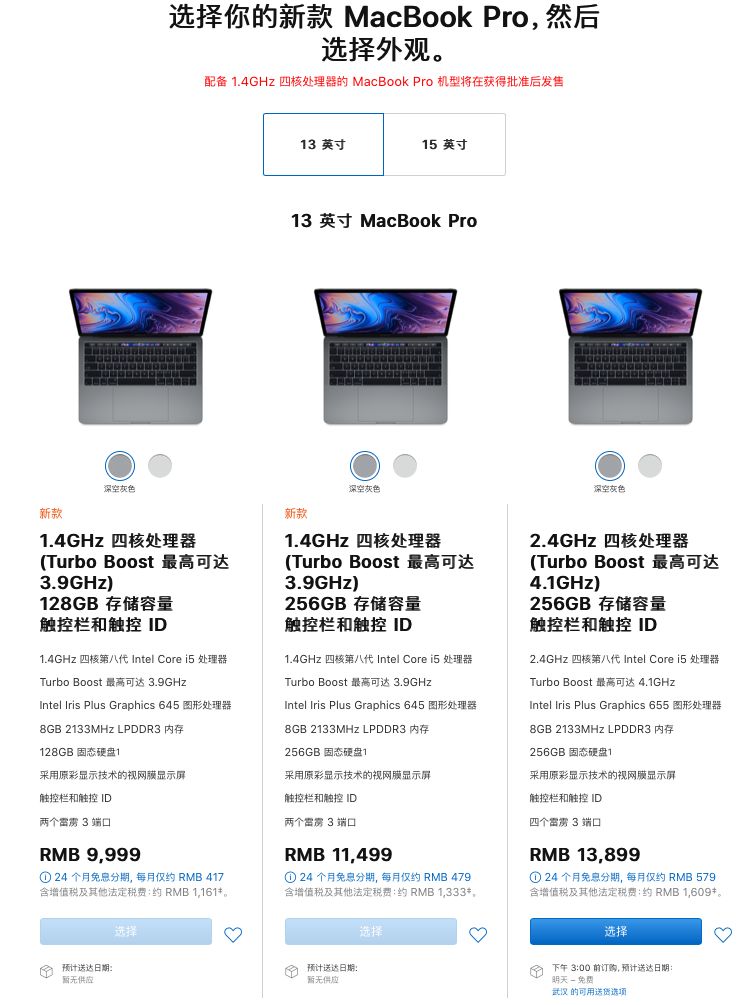 配置上,新款 13 英寸 MacBook Pro 搭载英特尔第八代四核酷睿 i5 处理器,但频率只有 1.4GHz ,支持原彩显示技术,全线标配 Touch Bar,LPDDR 3内存,2 个雷雳三接口,8+128GB 版售价 9999 元,8+256GB 版售价 11499 元。