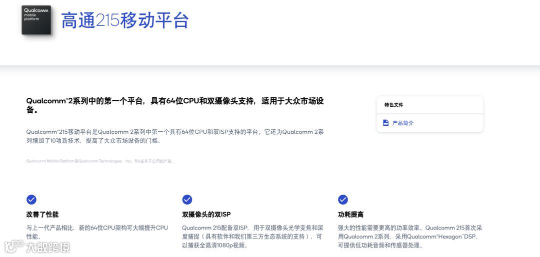 细节上,骁龙215支持最高13MP的双摄;1560*720分辨率屏幕;“令人难以置信的电源效率:5天以上的音乐播放,20多个小时的语音通话,10小时以上的视频播放”等等。至于定位,官方称骁龙215面向70美元-120美元(约合人民币482-826元)之间的低端机