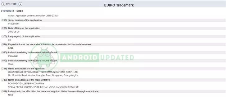虽然沈义人已经辟谣今年不会有OPPO Find X 2,但新旗舰肯定是不会少的。近日,Android Updated援引欧盟智慧财产局文件显示,OPPO于7月2日获得名为Enco的商标使用权,同时OPPO的一组折叠屏手机专利也获得公开,或许这款OPPO Enco就是为折叠屏所作准备。