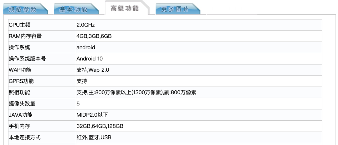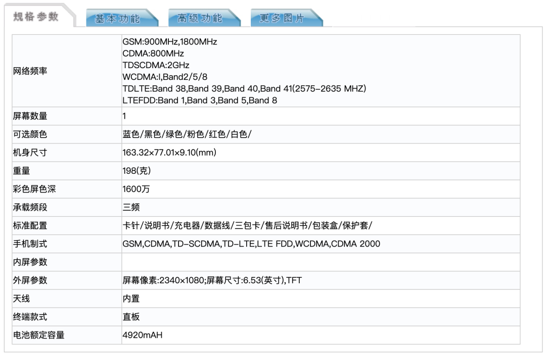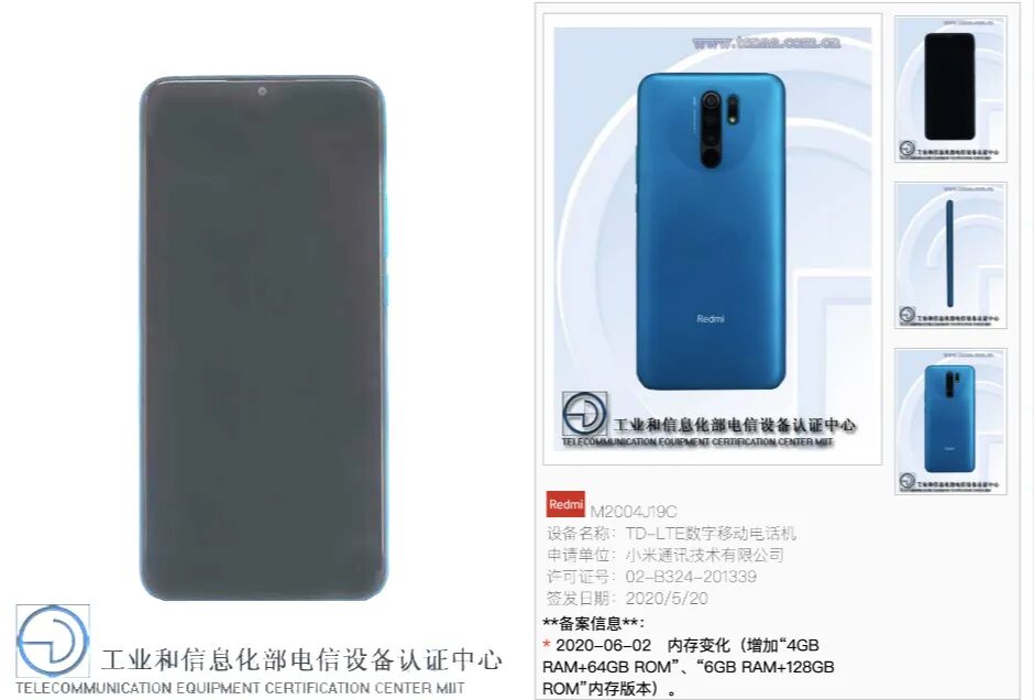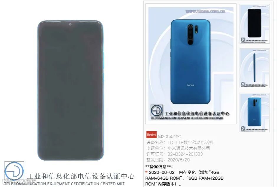 参数上,Redmi 9采用一块6.53英寸2340*1080分辨率19.5:9的LCD水滴屏,背部圆形竖排四摄,后置指纹,机身三围163.32*77.01*厚9.1 mm,重198g,电池容量额定值4920mAh,典型值5020mAh。
