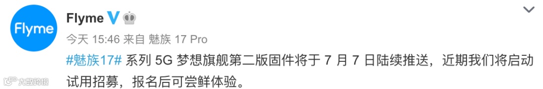今天官方也带来了普通用户的OTA固件推送时间,表示魅族17系列第二版固件将于7月7日陆续推送,近期将启动试用招募,报名后可尝鲜体验。