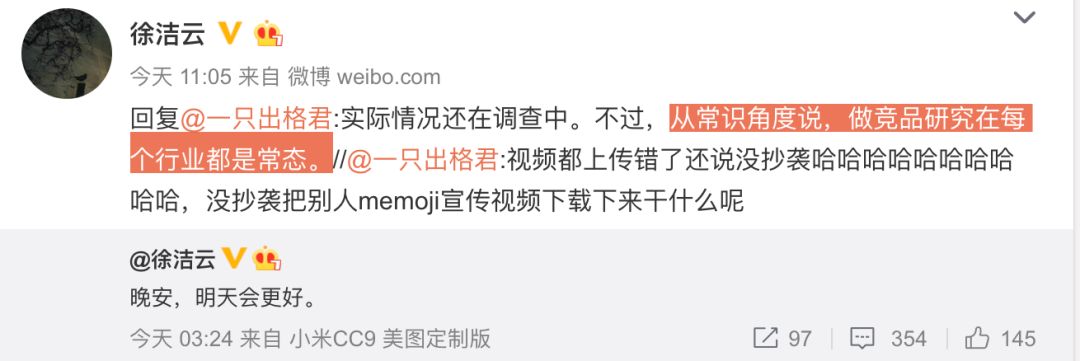 徐洁云表示:“感谢提醒纠正。经查的确是相关运营团队在京东平台页面上传过程中出错,上传了错误的内容。内部正在进一步调查并将严肃处理。 ”至于小米运营团队为什么会有苹果Memoji的视频,其也回应:“从常识角度说,做竞品研究在每个行业都是常态。”