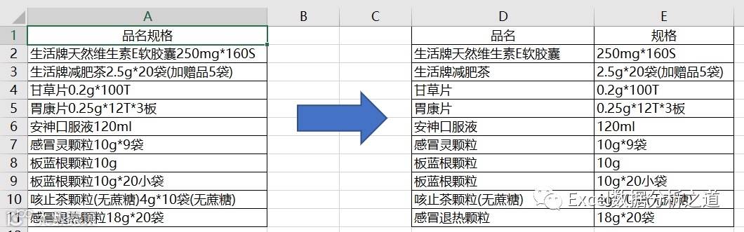 例如,有下面一个例子,要求将品名和规格拆分: