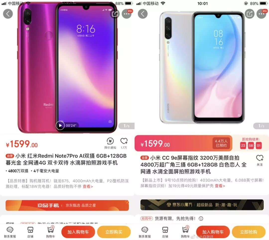 值得一提的是,今天也是小米CC9e首销的日子,其6+128GB售价1599元,恰好和Redmi Note 7 Pro同规格一致,就配置来说两款机型也各有优势,都是索尼4800W主摄,Note7Pro双摄,CC9e后置三摄,前置3200万像素,720P屏幕,你觉得CC9e有打到Redmi吗?