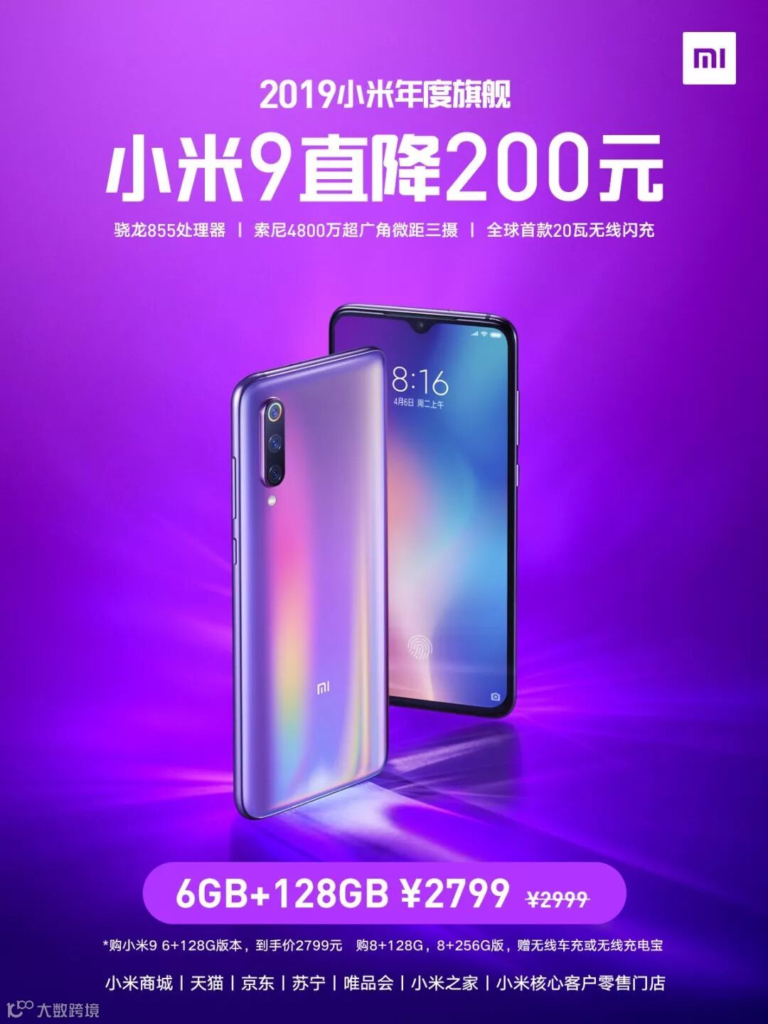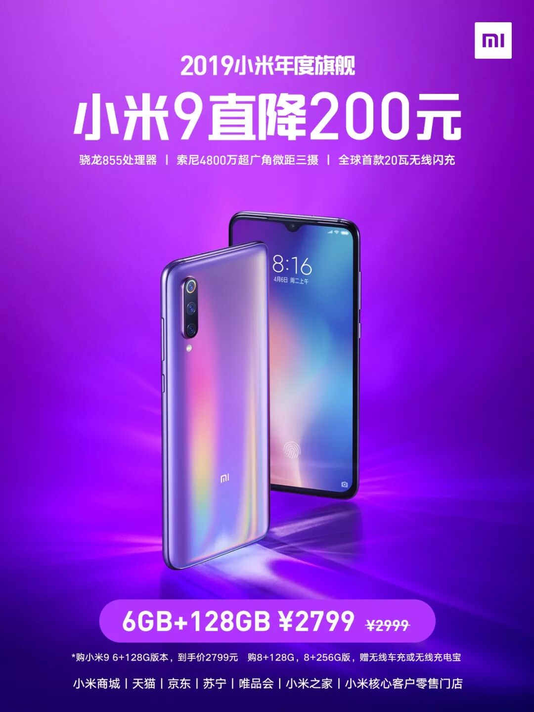 今天上午,小米手机官方公众号宣布小米9促销活动:小米9将于7月10日0点开启促销,6+128GB直降200元,到手价2799元,其他储存版本不降价但送169元的无线车充或149元的无线充电宝。