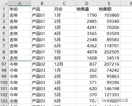 下图两年销售数据,现在要求使用数据透视表分析两年同比增长情况。