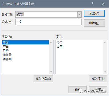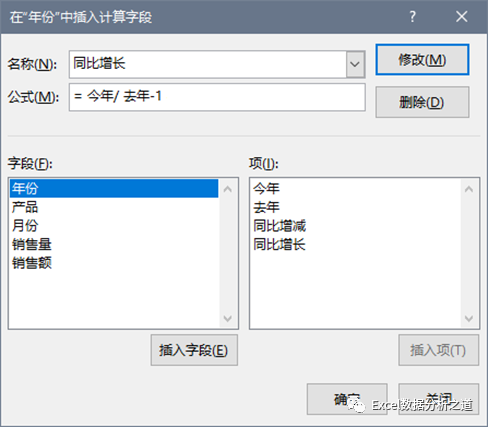 首先要弄清楚,同比增减额和同比增长率都是用去年和今年的数据计算的,而“去年”和“今年”是字段“年份”下的两个项目,它们并不是字段,因此是要为数据透视表添加计算项了。