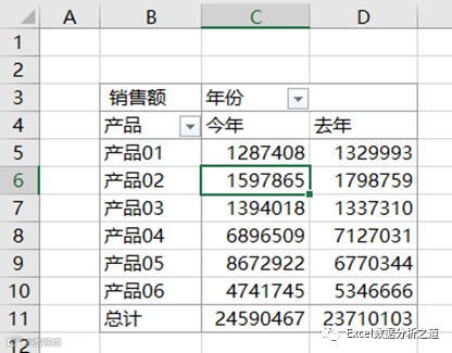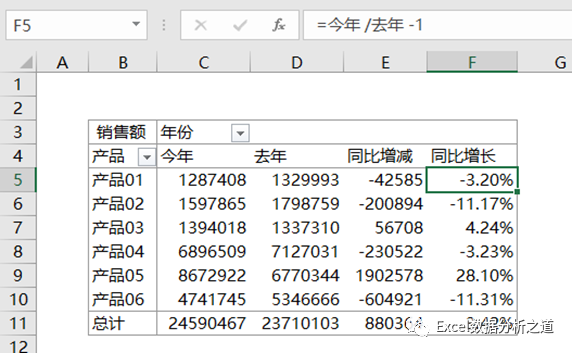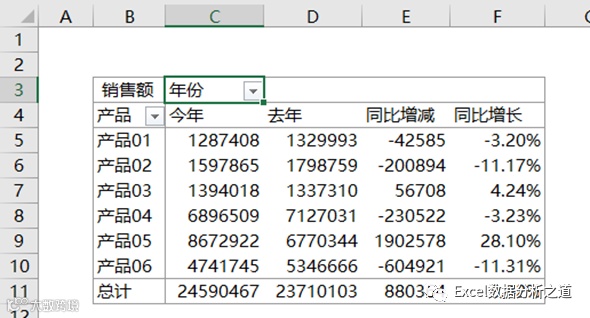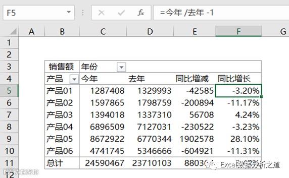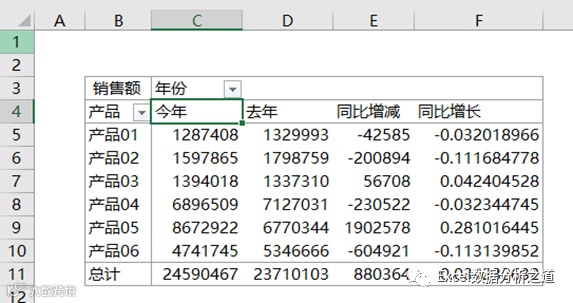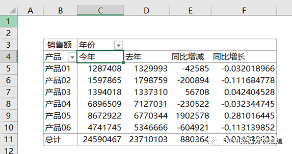 其实这不奇怪,最底部的总计数是列总计,本来就是各列所有项目的SUM结果。因此,所有产品销售额合计数的同比增长率,是不能使用透视表的列总计数的。