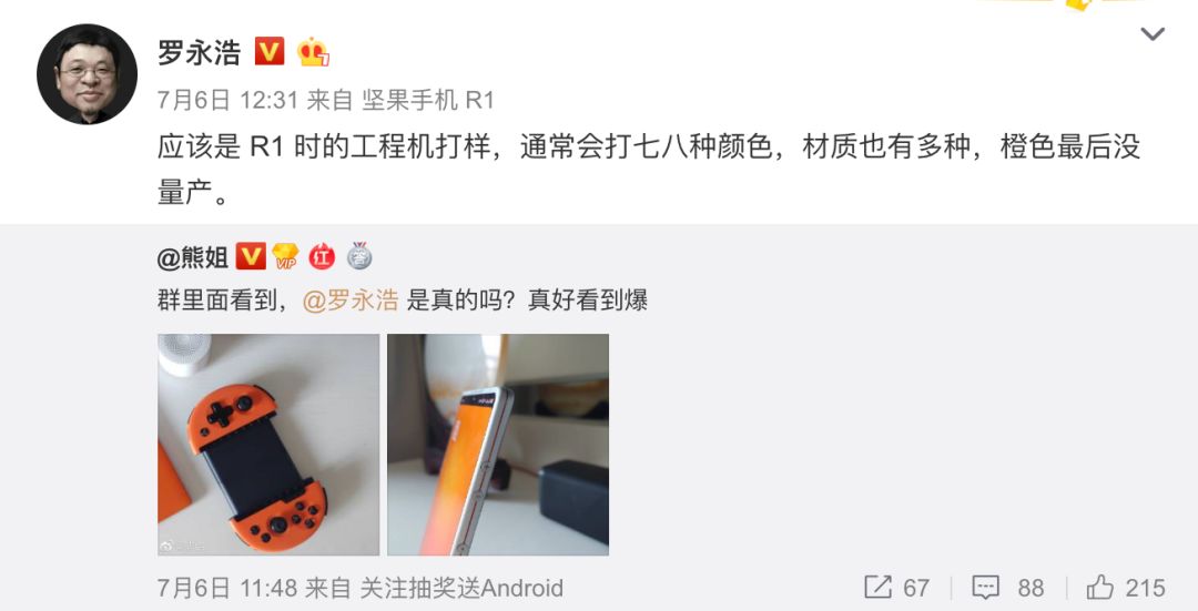 另外,最近异常活跃、或准备新品发布会的罗永浩转发了一条坚果R1的微博,该微博晒出了两张橙色版的坚果R1,罗永浩表示:“这应该是坚果R1的工程机打样,通常会打七八种颜色,材质也有多种,橙色最后没量产。”