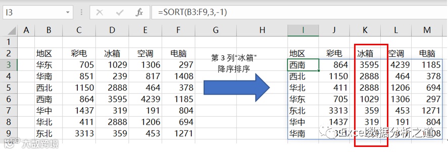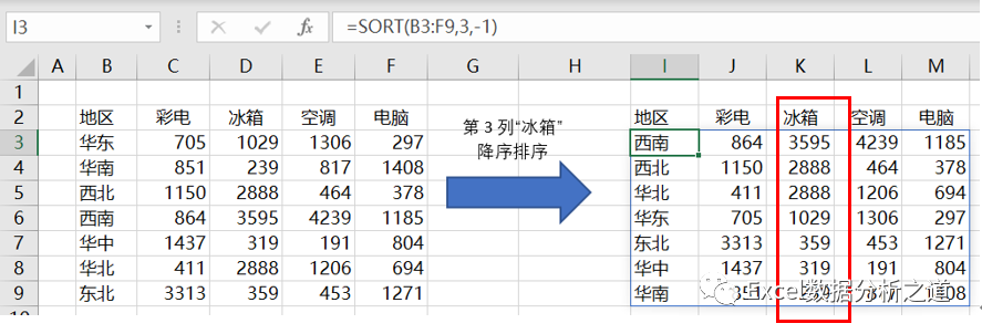 对数据区域的第3列“冰箱”降序排序(从大到小),单元格I3的排序公式如下: