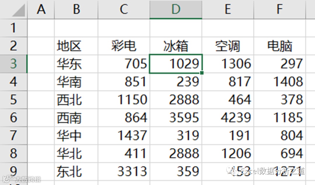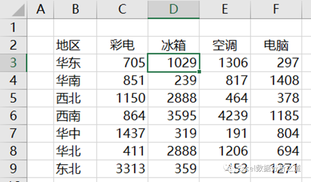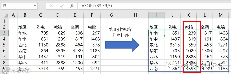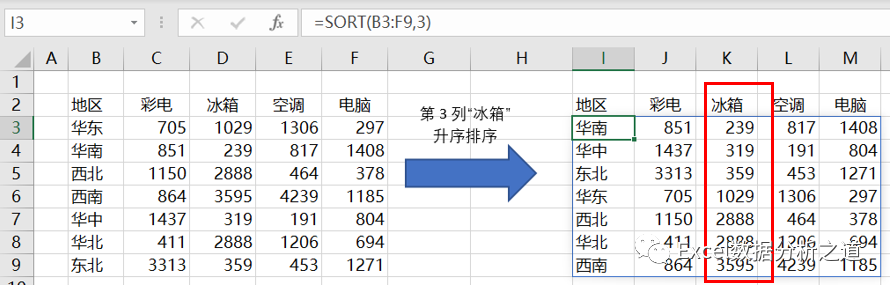 对数据区域的第3列“冰箱”升序排序(从小到大),单元格I3的排序公式如下: