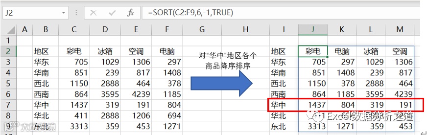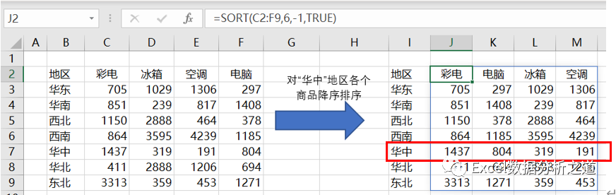 注意,上面的两个示例,是在列方向上进行行与行之间的排序,因此排序表上,要先输入列标题(商品名称),而地区列以及各个商品数据列区域B3:F9,则是函数的要排序的数据区域。