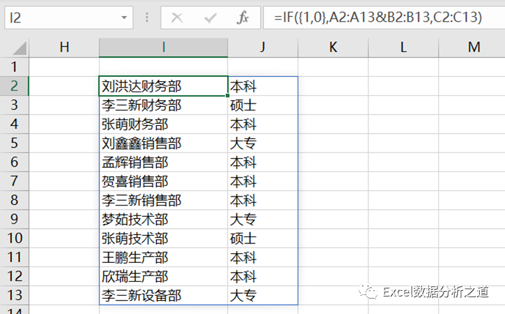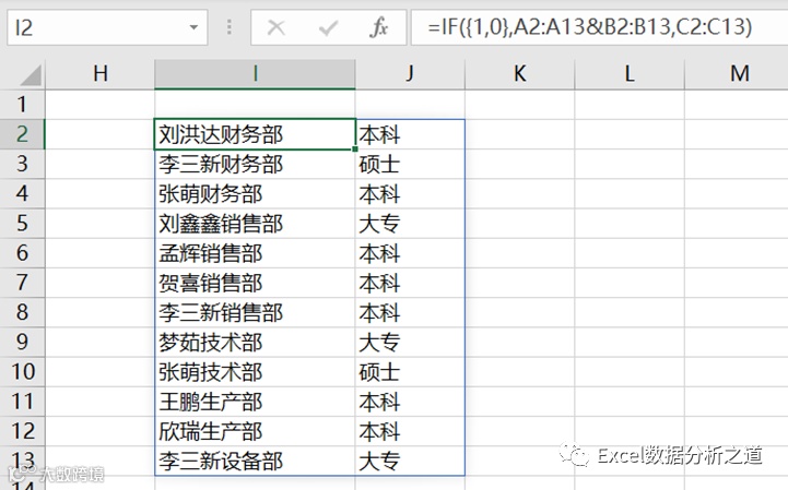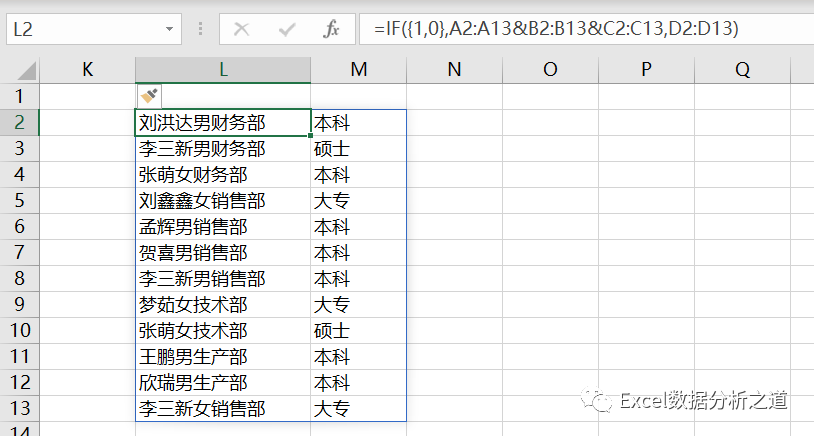 它有两列数据,第一列是姓名、性别和部门连接成的新文本,第二列是学历,如下图。