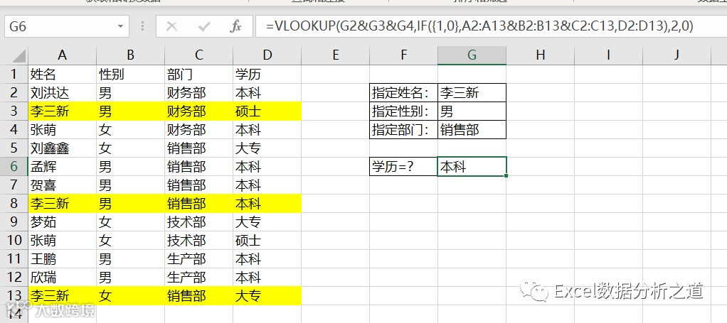 例如,对于下图,有几个重名的、在不同部门或同一个部门、不同性别的人,如果将姓名、部门和性别组合起来,就是唯一条件了,这样,我们可以根据姓名、性别和部门来查找学历,查找公式如下: