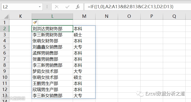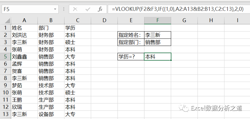 它有两列数据,第一列是姓名和部门连接成的新文本,第二列是学历,如下图,这样,将查询条件也连接成一个新文本条件值,从而实现从第一列匹配新条件,从第二列提取数据。