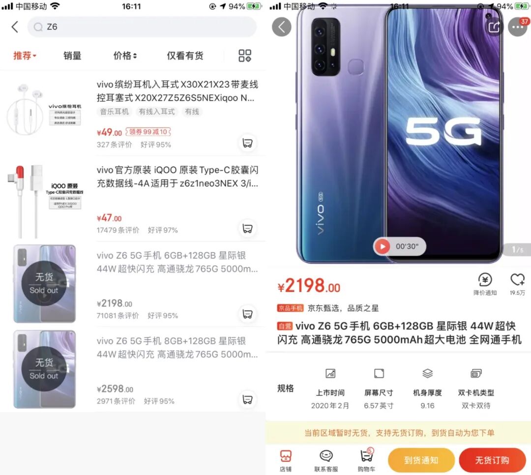 据了解, vivo Z6 发布于今年 2 月 28 日, 6.57 英寸 LCD 右上角小直径单挖孔屏,后置指纹,前置 16MP ,后置四摄 48MP+8MP+2MP+2MP ,骁龙 765G 支持双模 5G , 5000mAh 电池, 44W 快充,不支持 NFC ,保留 3.5mm 耳机孔。
