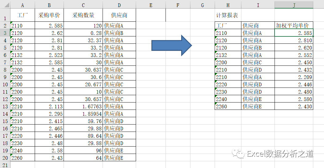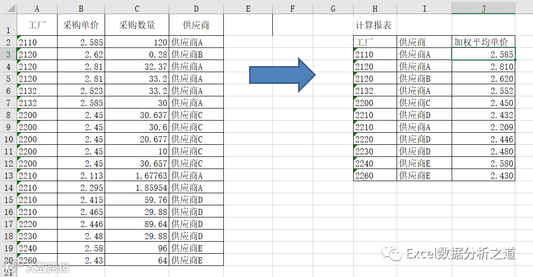 这是两个条件下的加权平均值计算问题:一个条件是工厂,一个条件是供应商,有人说,直接使用SUMIFS函数计算出采购总额,计算出采购数量,将两个数相除不就行了吗?先生,想得太简单了,这个计算出来的不是加权平均,是算术平均。