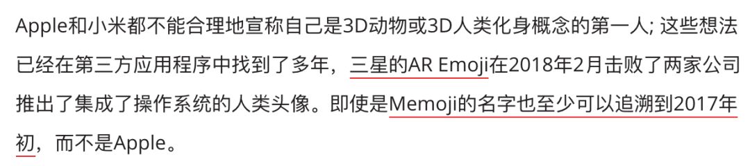 同时科技博客VentureBeat指出,memoji的概念和用法早在苹果去年夏天在全球开发者大会(WWDC)将其引入iMessage之前就已经存在了。事实上,三星比这两家公司更早推出AR卡通形象功能。苹果并不是虚拟形象概念的所有者,也没有Memoji的商标,所以说小米侵犯了iPhone制造商的知识产权是不公平的;