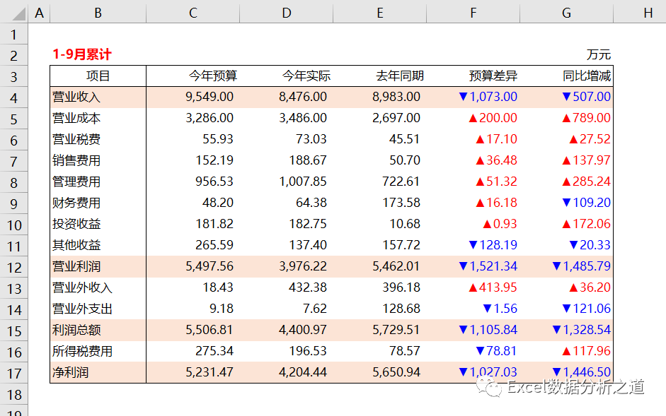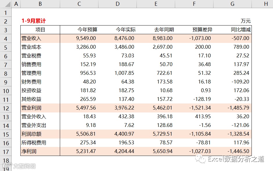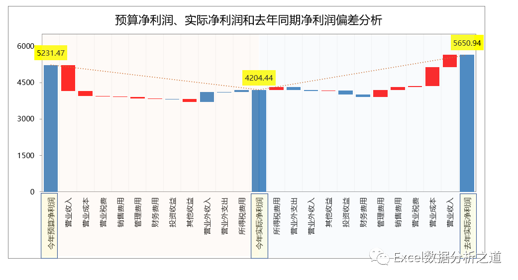 这是对报表的最基本信息展示,目的是要清晰看出,为什么今年净利润比去年下降那么多,而且预算还没完成。