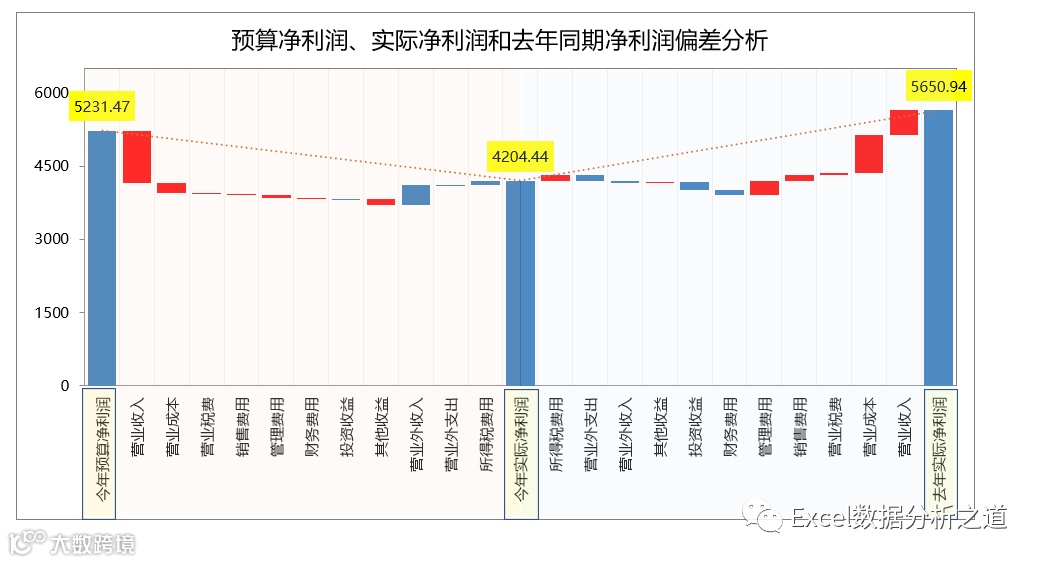 这还不够,你需要将去年数、预算数和实际数进行差异因素分析,看看净利润到底是怎么回事: