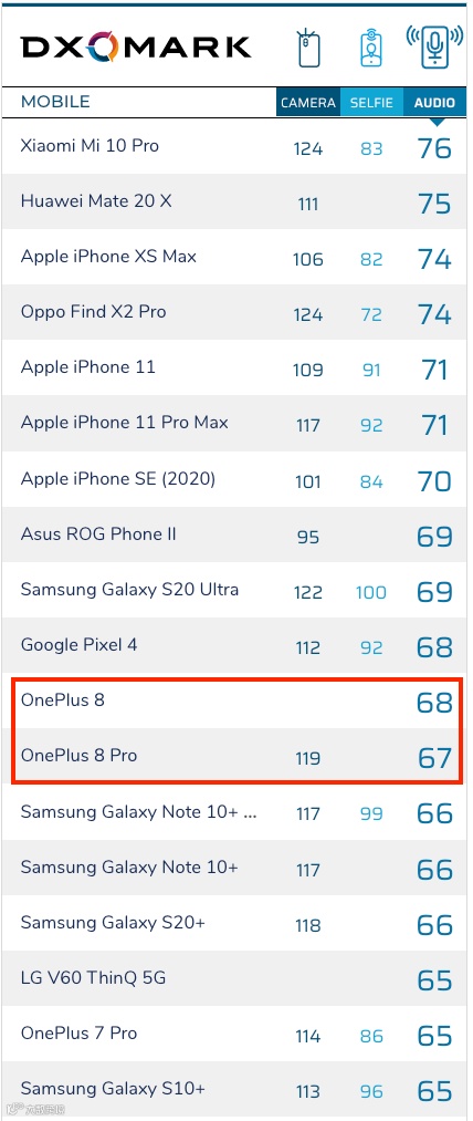 如上图所见,DxOMark音频榜上,一加8综合成绩68分(外放单项69分,录制单项66分);一加8 Pro综合成绩67分(外放单项68分,录制单项63分),标准版比Pro版表现还好,估计Pro用户看了心情多少有些复杂。