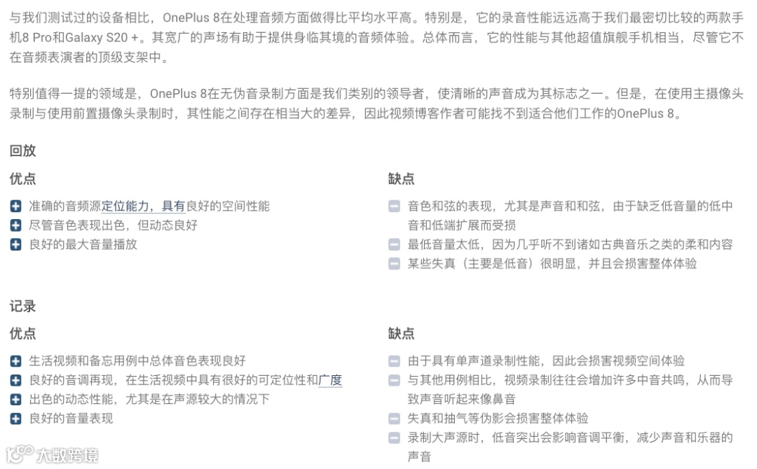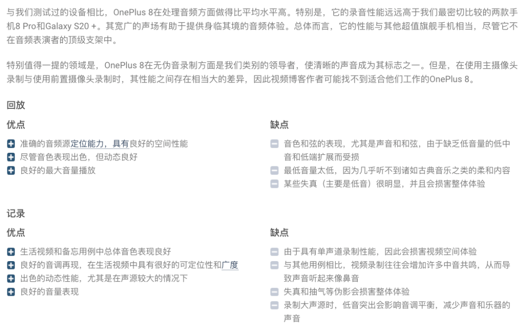 最终DxOMark给出的评语是:一加8播放音频具有良好空间感,让OnePlus 8在玩游戏时,能相对的强而有劲;大多数情况下使用主摄像头时录制音频时,能准确的录制语音且表现特别出色,但当录制响亮的声源时,过多的低音会影响听众听见语音和乐器的清楚度。