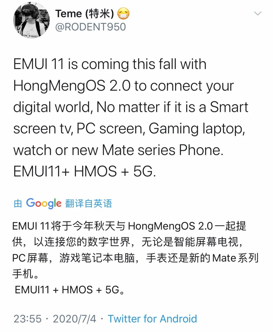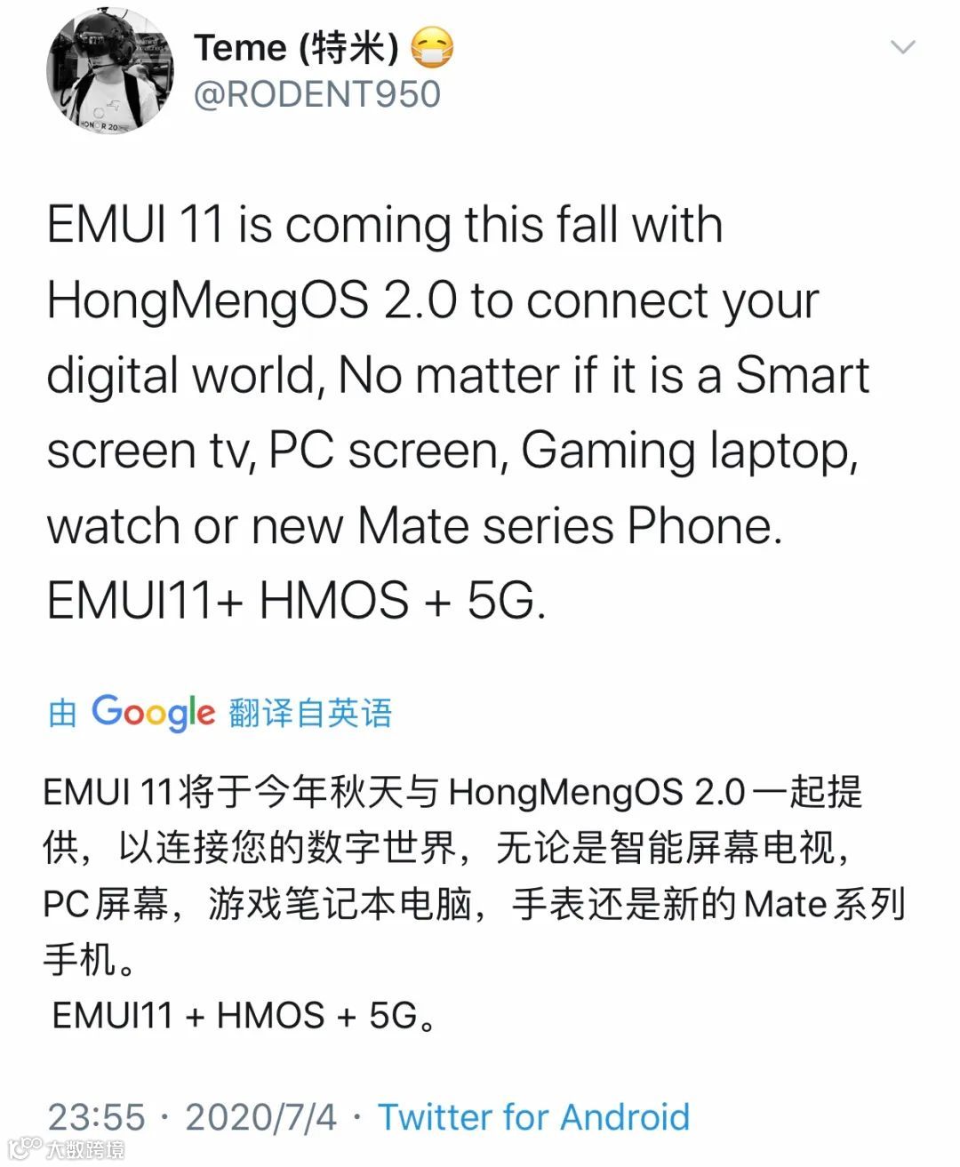 据推特大神Teme爆料,EMUI 11将和华为鸿蒙OS 2.0 一起在今年秋天和Mate 40系列一起发布,届时将进一步打通智能屏、PC、笔记本、手表、和全新的 Mate 40系列手机等全生态。