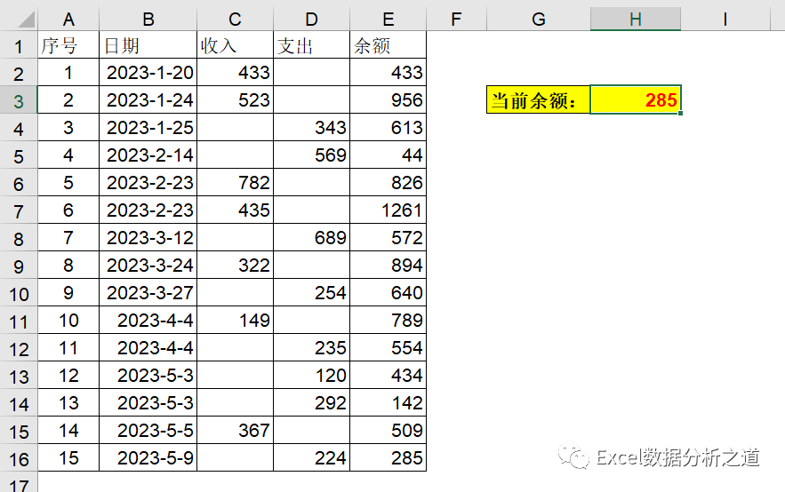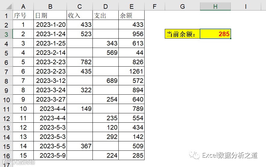 所谓最新余额,对于本表而言,就是E列最后一个单元格数据。