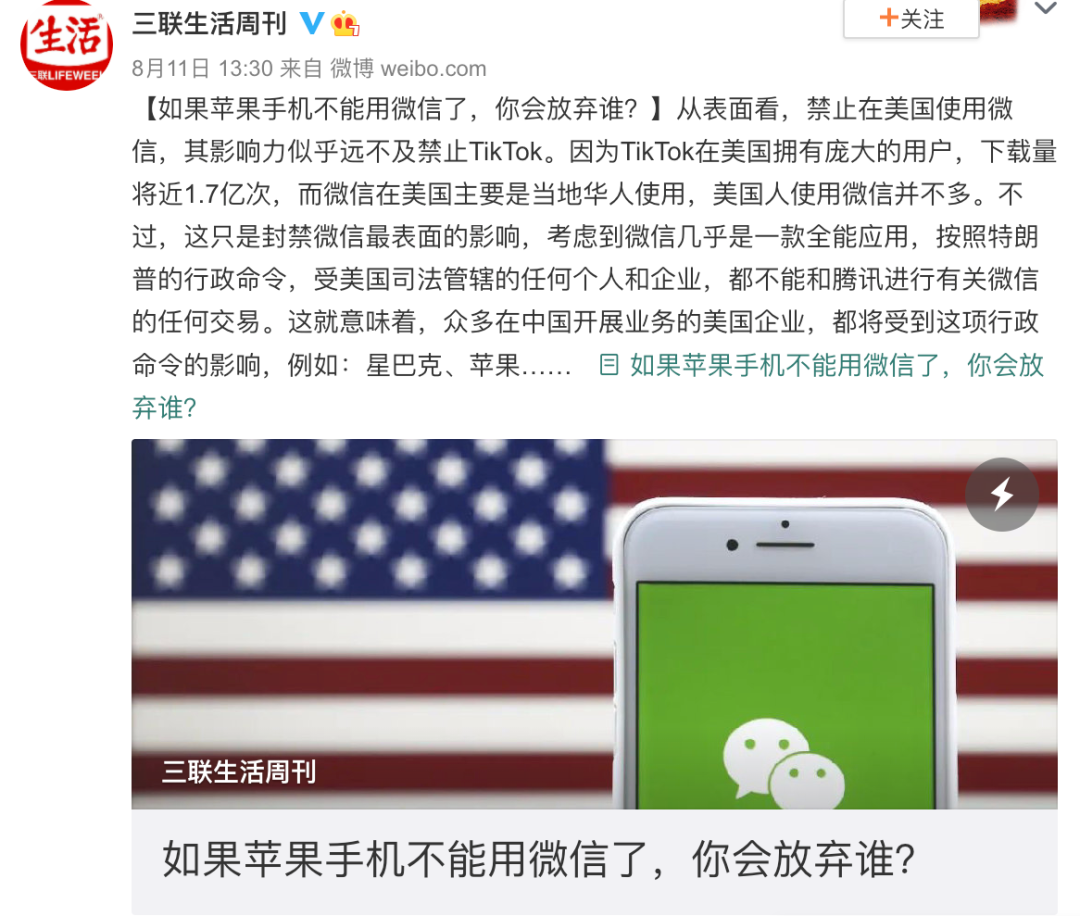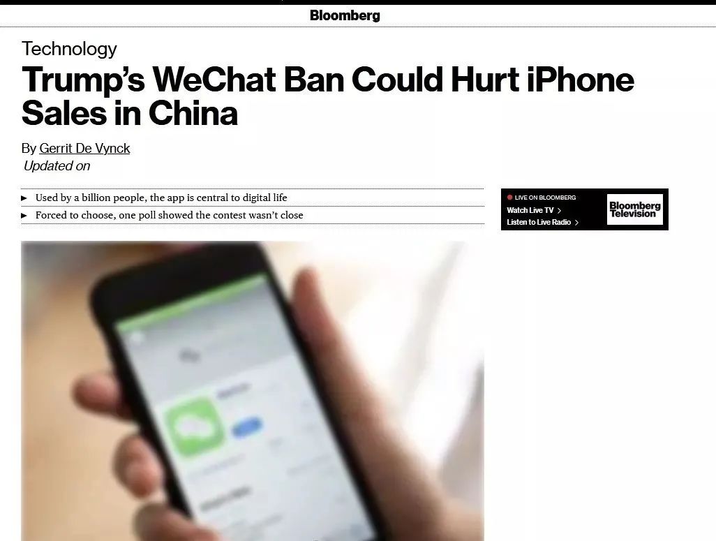 据了解,美国总统川普已于上8月6日签署行政命令,禁止受美国司法管辖的任何人和企业与腾讯进行任何有关微信的交易,并将在45天后生效。