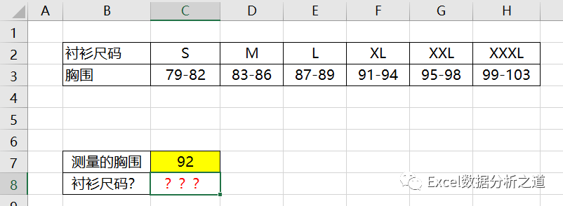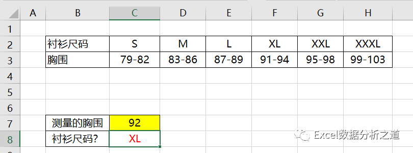 我们一眼就可以看出,是眼睛看、脑子判断:92在胸围91-94之间,因此衬衫尺码是XL。