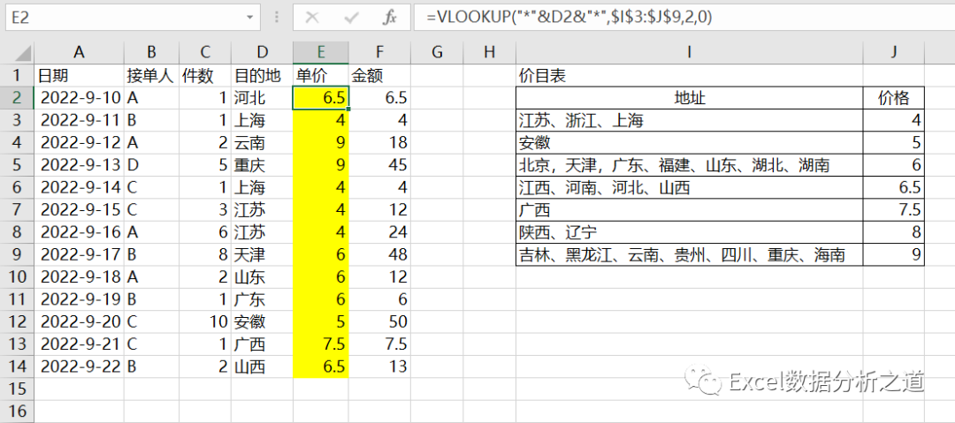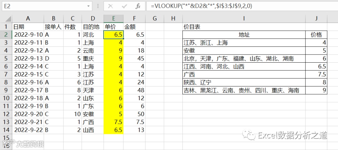 下图是一个收单记录表,希望在D列输入某个地区后,E列自动从价目表里匹配出价格来。但是,价目表里的地址并不是一个单元格就只保存一个地区名称,而是把价格相同的地区保存在了一个单元格,此时,查找的条件就是从某个单元格里查找是否含有指定的地区名字了,这种情况下,在查找条件里使用通配符即可。单元格E2的公式如下。