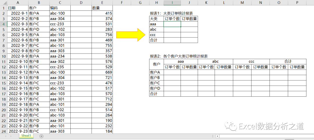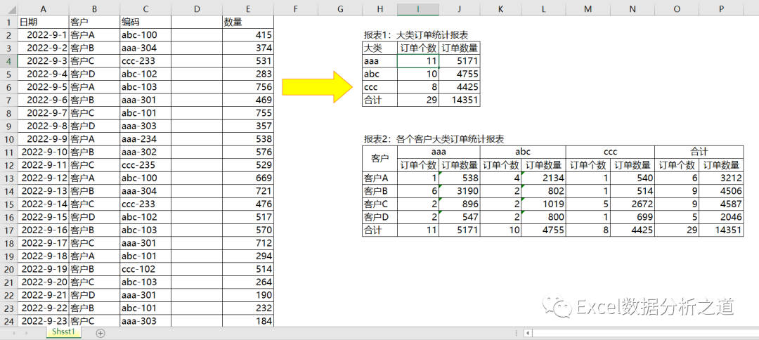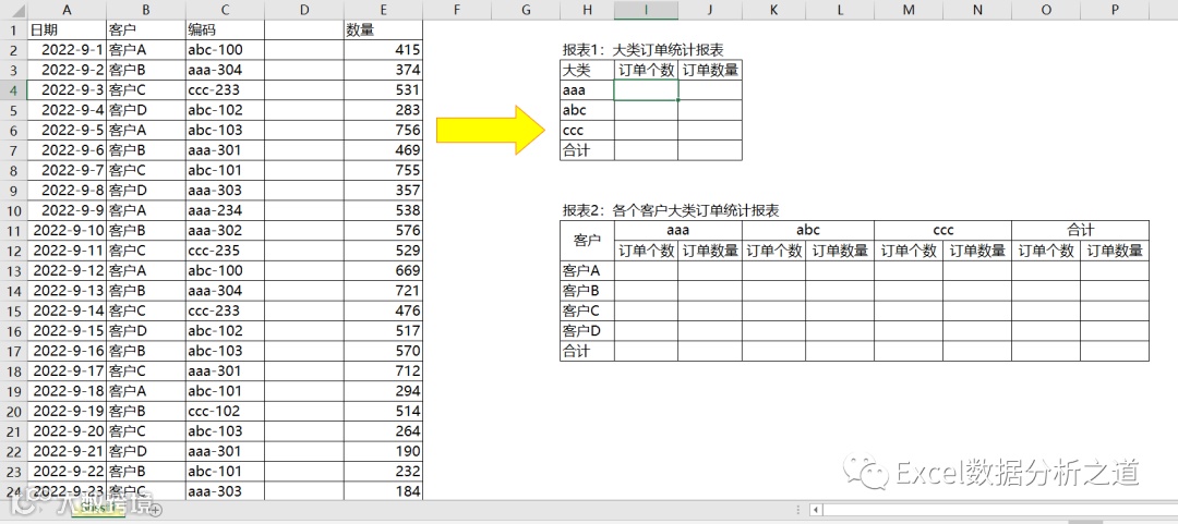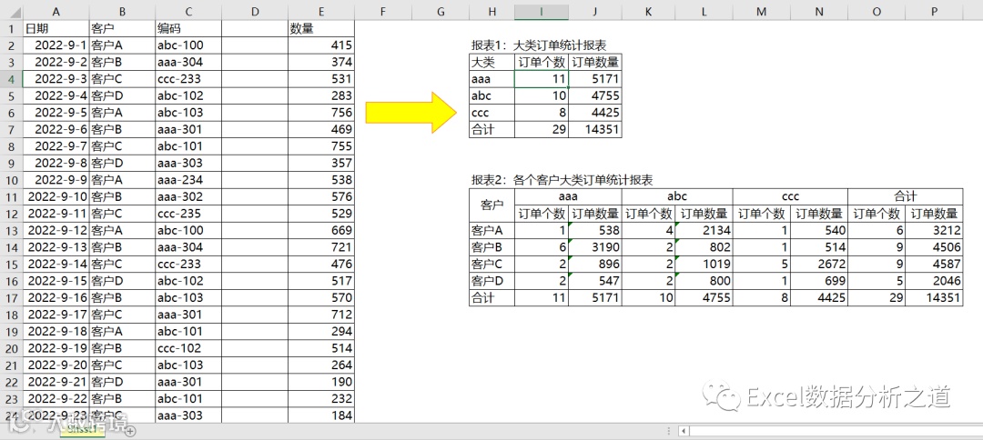 在报表2中,计算每个客户、每个大类的订单数量,就是统计指定客户(是精确条件)和指定大类名称开头的关键词的多条件求和,因此订单个数的计算公式如下: