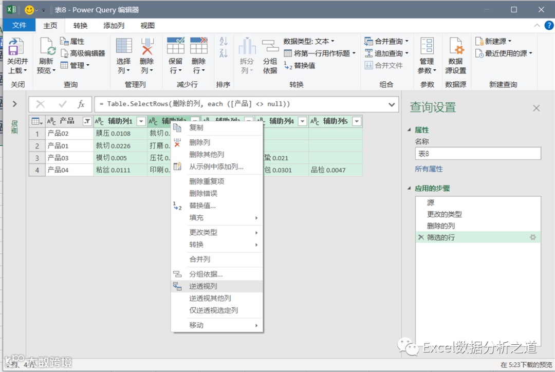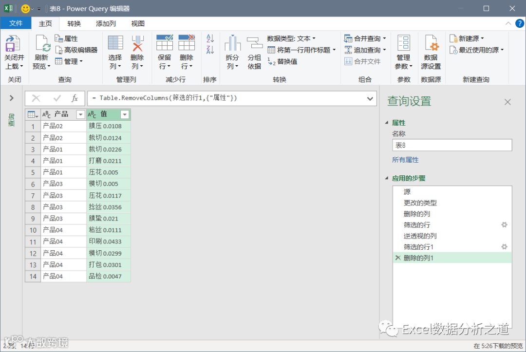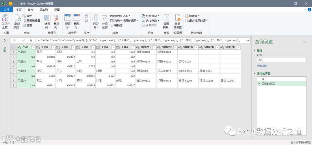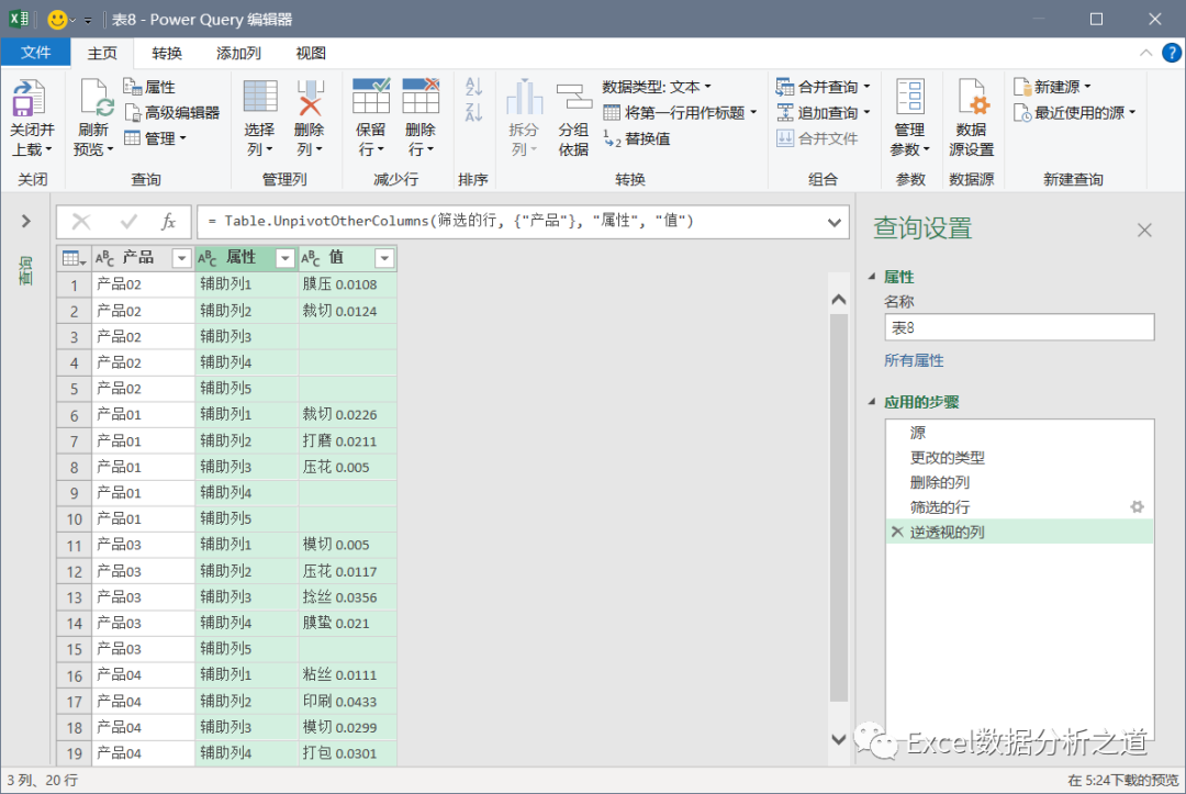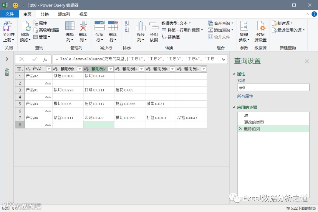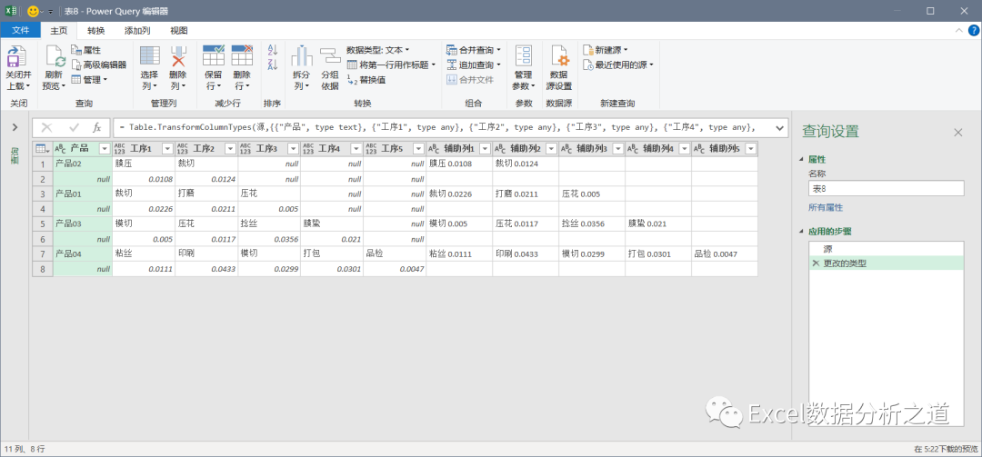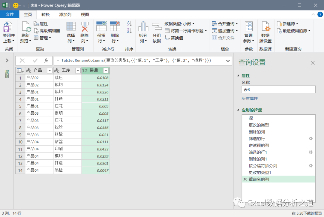 有这样一个例子,左侧是各个产品的工序和损耗,要把该表格转换为右侧的一维表。