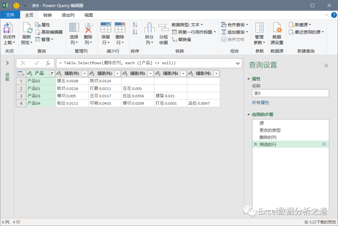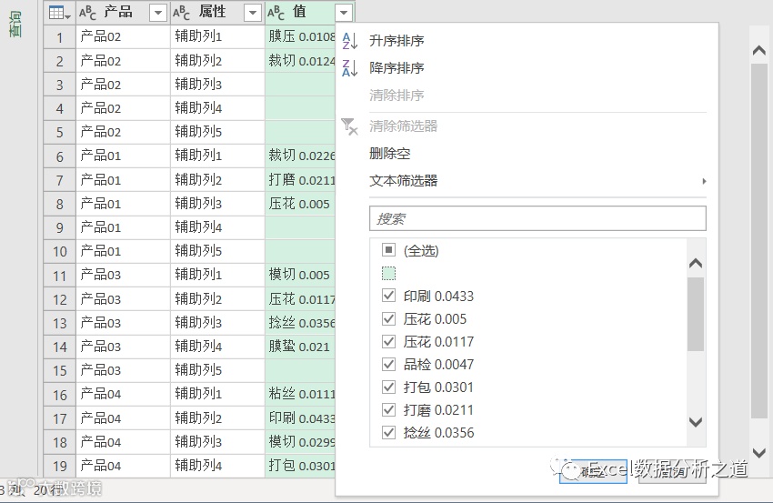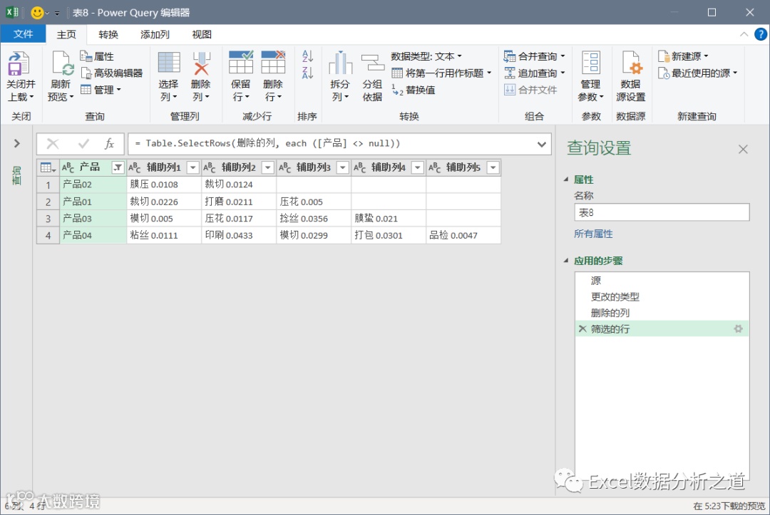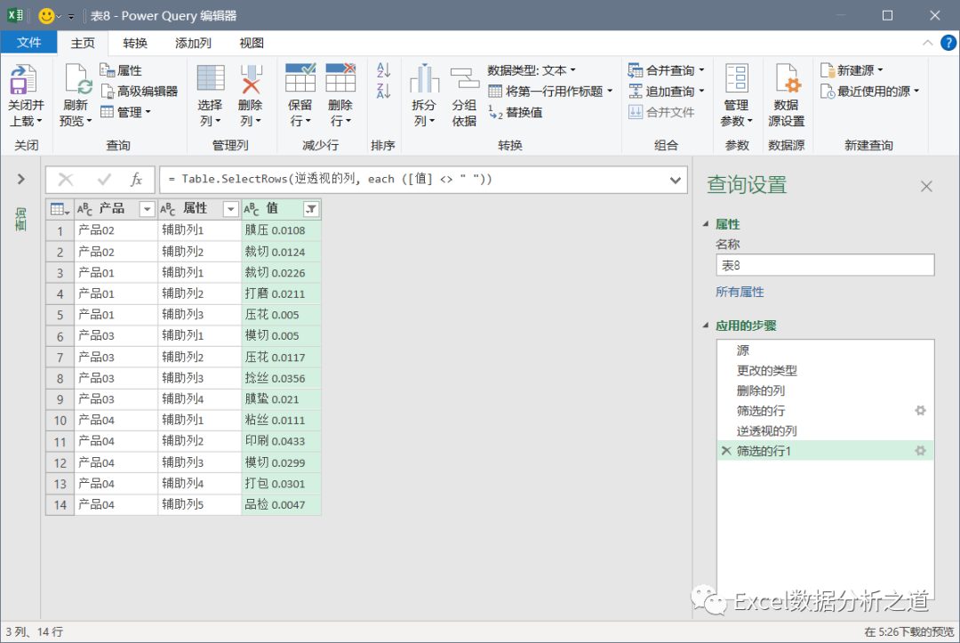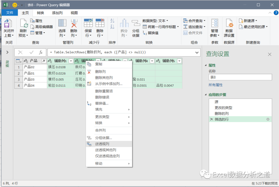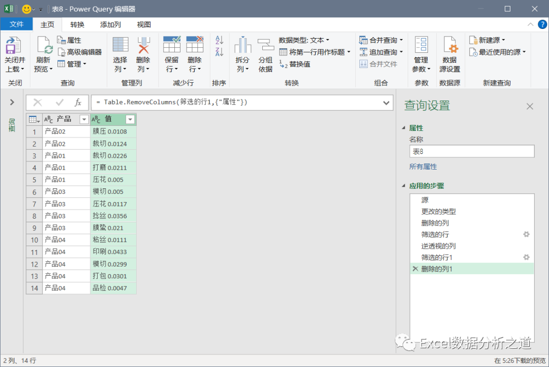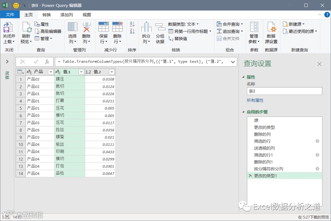 有这样一个例子,左侧是各个产品的工序和损耗,要把该表格转换为右侧的一维表。