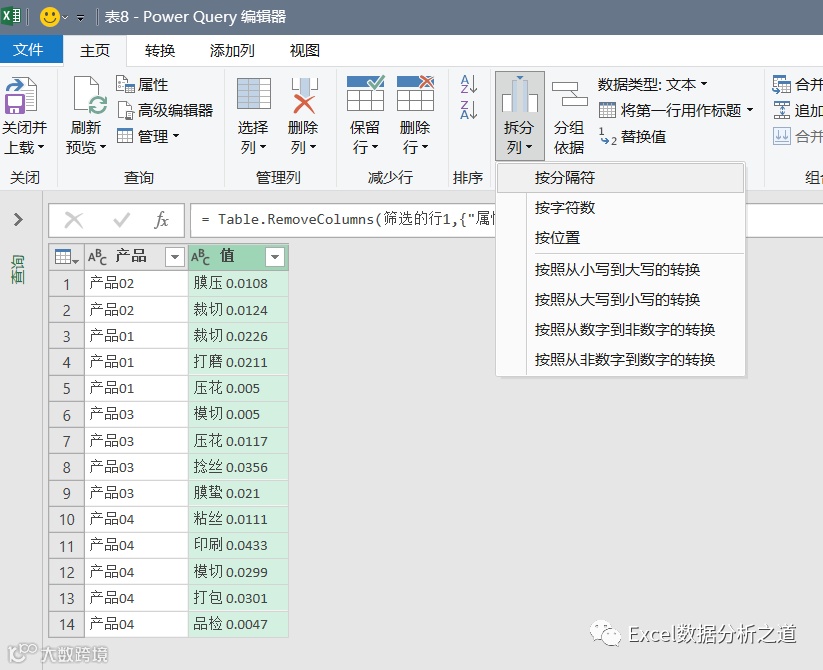 选择“值列”,进行拆分列,按照空格拆分: