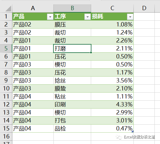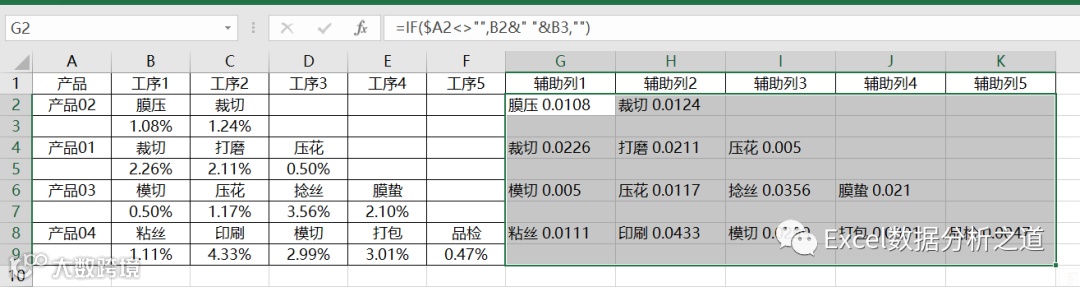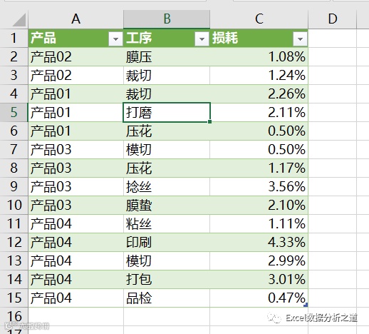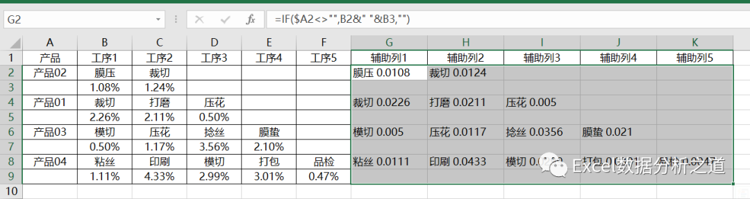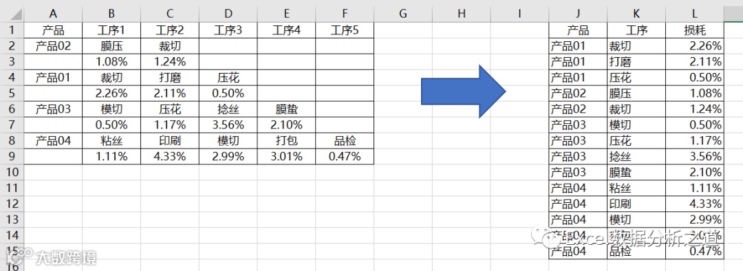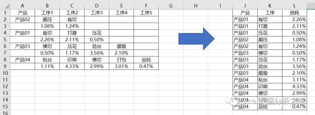 这样的问题,一看就会想到逆透视操作,而逆透视的首选工具是Power Query,但是,这个例子要复杂了些,因为每个产品是两行数据:第一行是工序名称,第二行是工序损耗数字。
