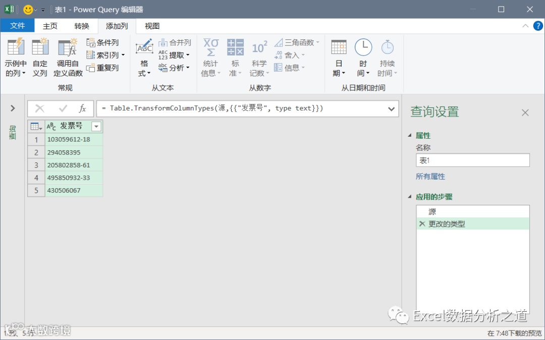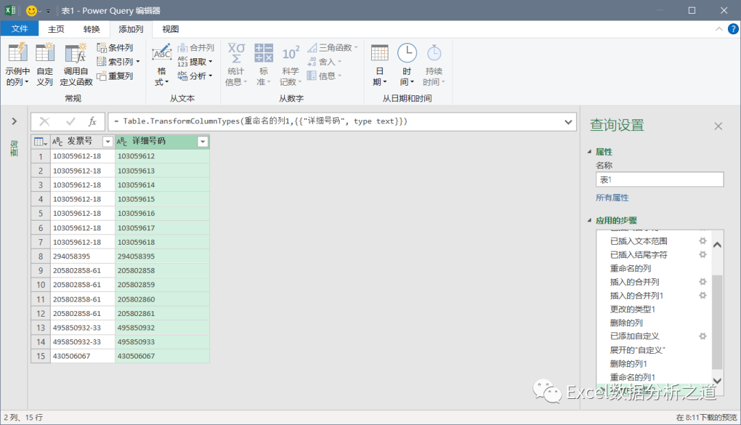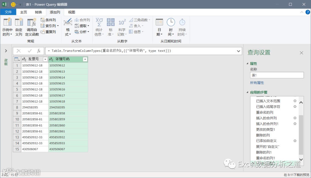 删除掉中间的两列,把自定义列数据类型设置为文本,并修改字段名称为“详细号码”: