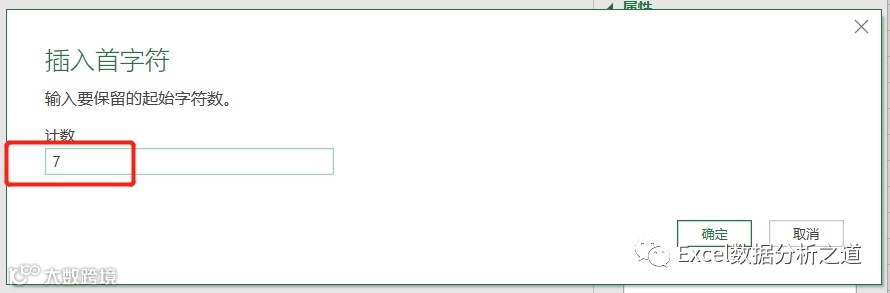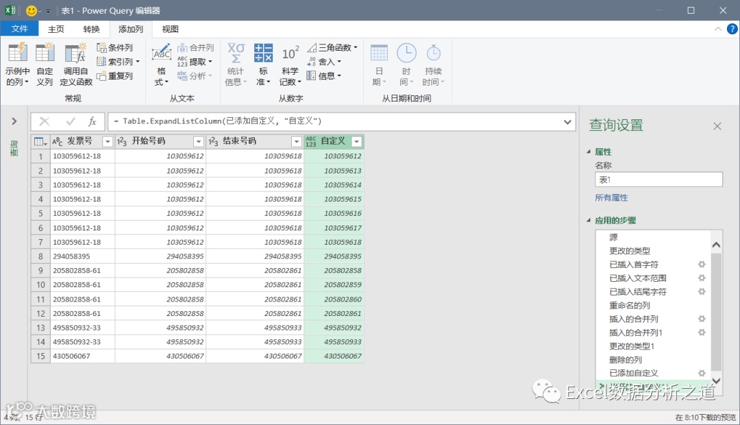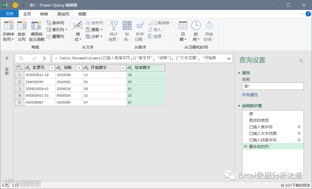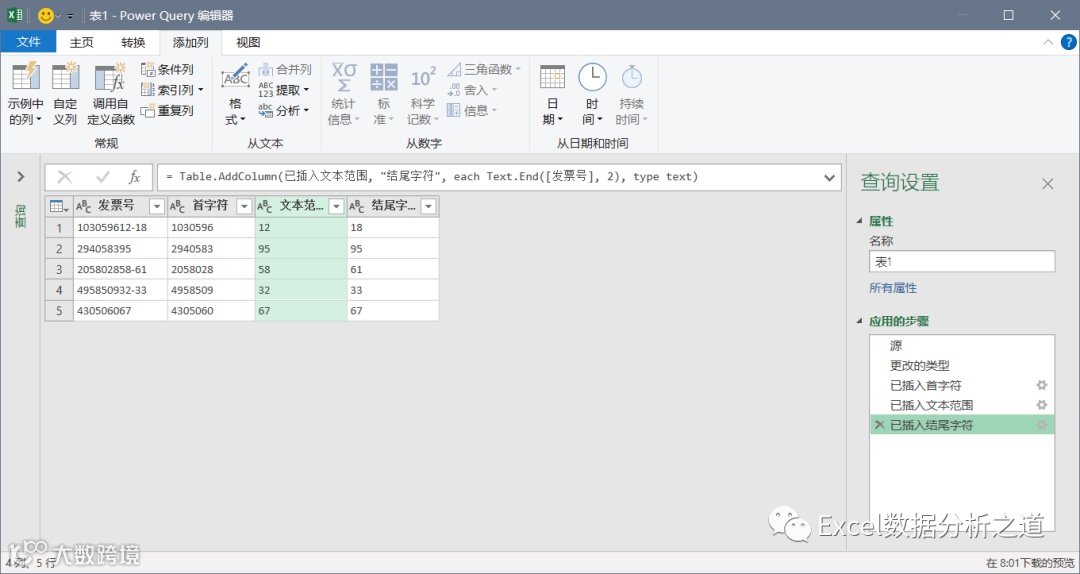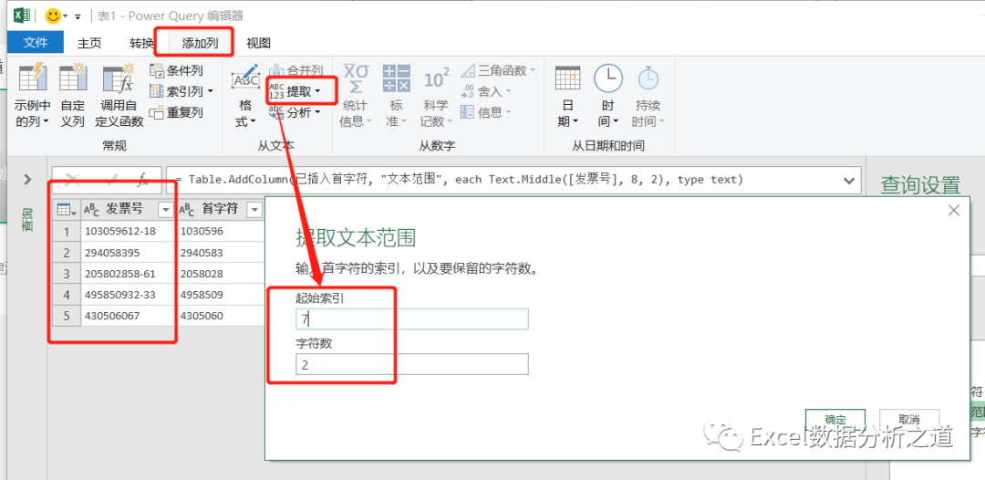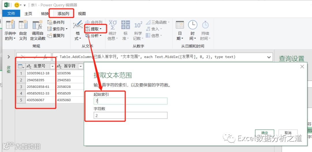 继续执行提取命令,分别从发票号中提取开始数字(第8位开始,2位数字,不过要注意,在PQ中,第一位数字的序号是0,因此设置的开始位置应该输入7,而不是8),和结束数字(最右侧的2位数字):