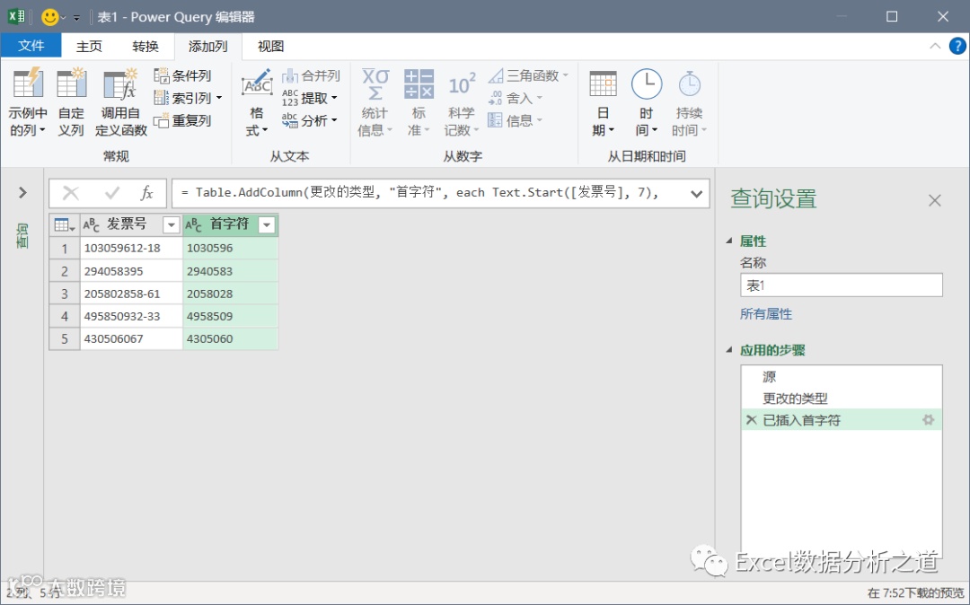 执行添加列--提取--首字符 命令,提取发票号词根(假如是左边的7位数):